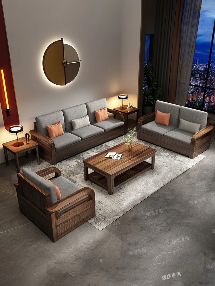 新中式スタイルの無垢材ソファセット - モダンでシンプルなリビングルーム向け、布張りの禅デザイン、黒胡桃の家具で心地よい空間を演出!