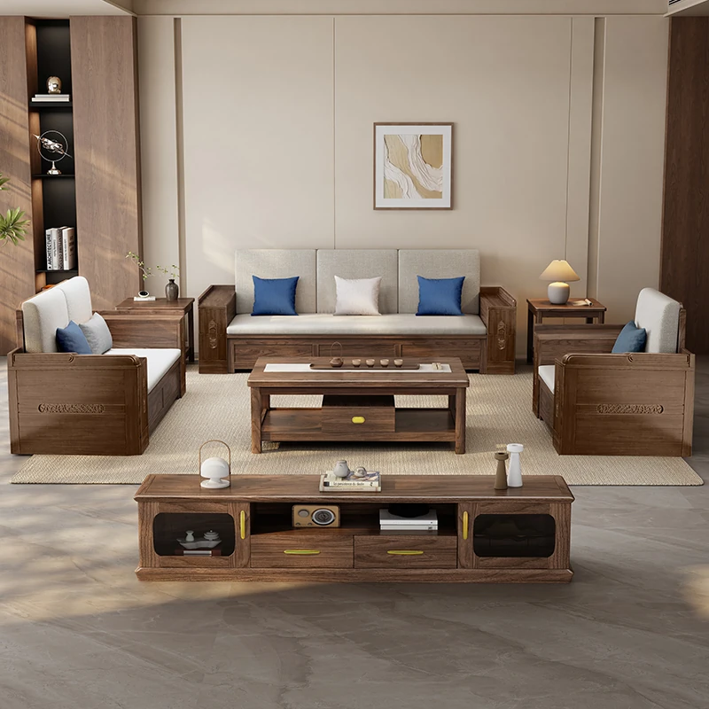 現代的なシンプルさと伝統的な美しさが融合した新中式の無垢材ソファとテーブルのセット。リビングルームにぴったりなブラックウォールナットの家具で、心地よいくつろぎの空間を演出します!