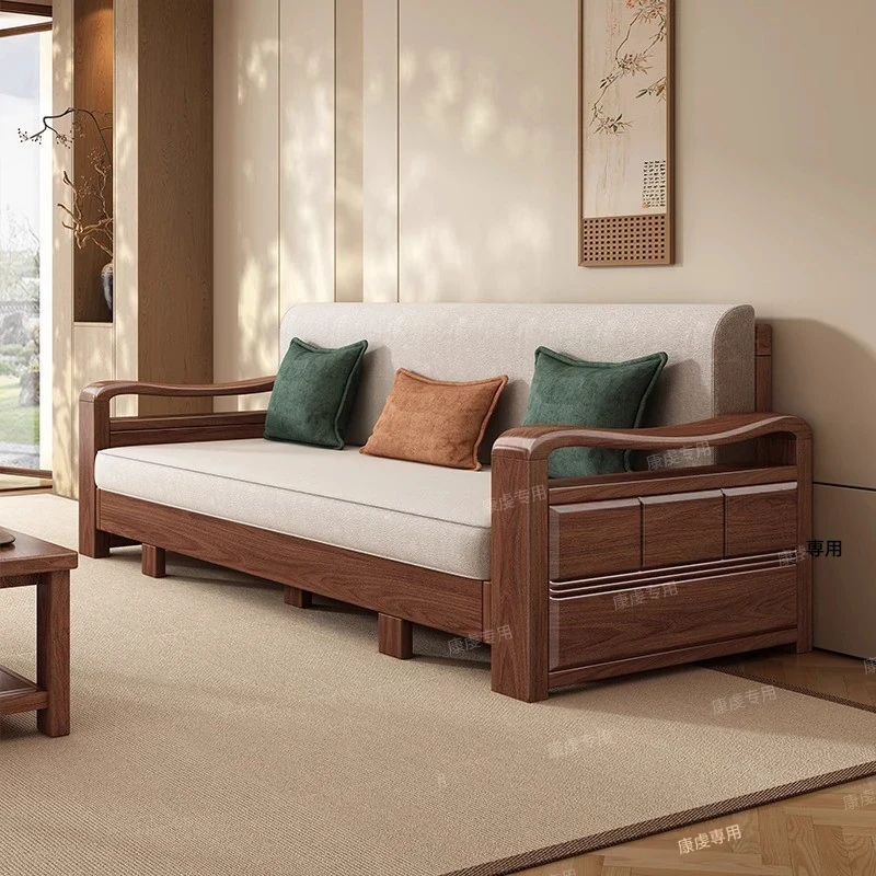 2024新作 中式黒胡桃木製ソファ収納付き 冬夏両用 木と布のシンプルデザイン 小型・大型リビングにぴったりの実用的なアイテム!