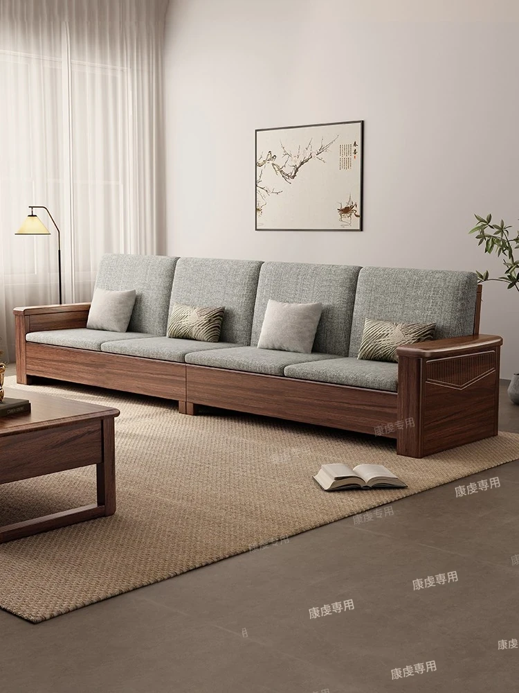 宋風美学のブラックウォールナット無垢材コットンリネン布製ソファー 新中式リビングルーム用 四人掛けコンパクトデザイン 家庭用小型住宅に最適!