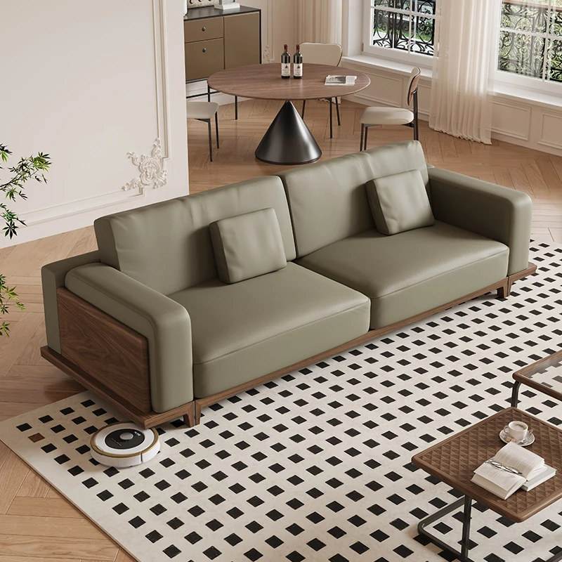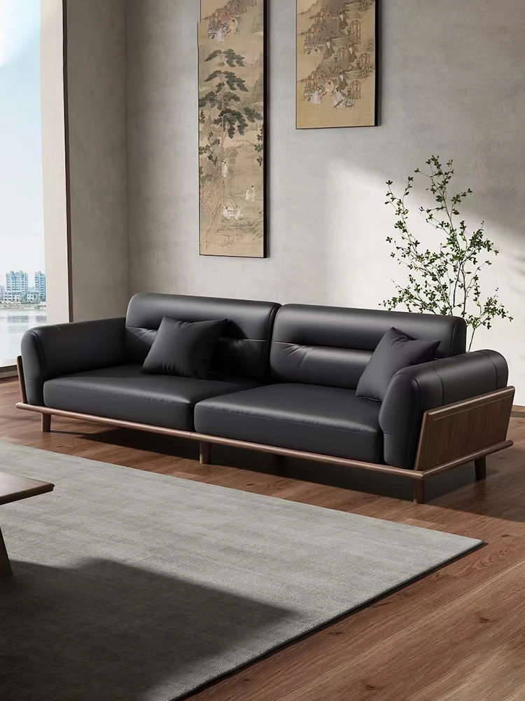 ブラックウォールナット製の軽奢全木製ソファ - モダンな中式デザインで、広々としたリビングや別荘にぴったり!高品質のレザーを使用した大サイズソファで、快適さとスタイルを兼ね備えています。