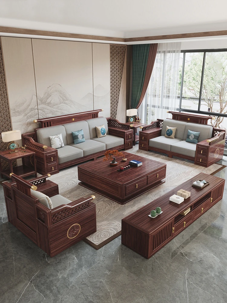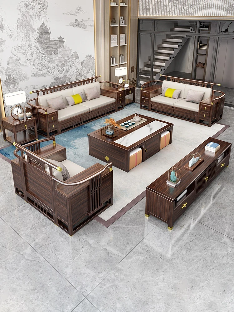 新中式全実木ソファセット - ブラックウォールナット材の高級感あふれるリビング用ソファ。広々とした大空間にぴったりのモダンでシンプルなデザイン!おしゃれで快適な空間を演出します。