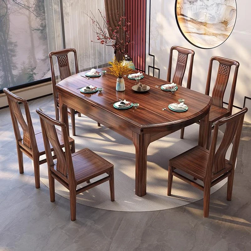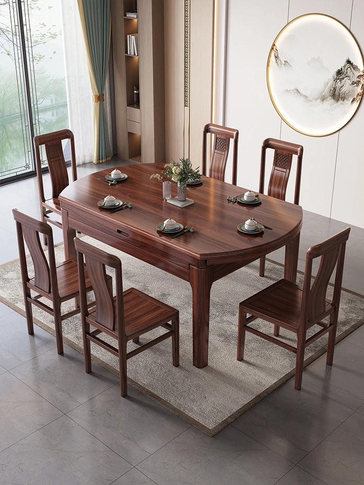 南米産ブラックウォルナット無垢材の折りたたみ伸縮可能なダイニングテーブルセット - 家庭用に最適な円形・四角形両用デザイン!おしゃれで実用的な食卓を実現します。