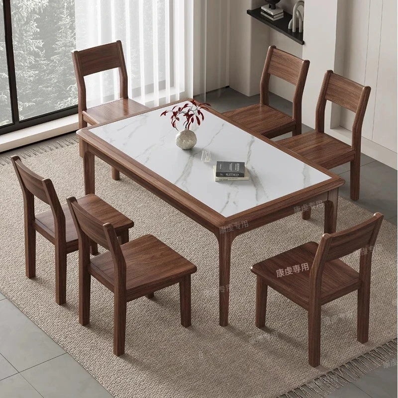 新中式スタイルの無垢材使用!高級感あふれる岩板とウ金木のダイニングテーブル。小型住宅にもぴったりな長方形デザインで、全て無垢材仕立てのテーブルと椅子セット。家族団らんのひとときを演出します!