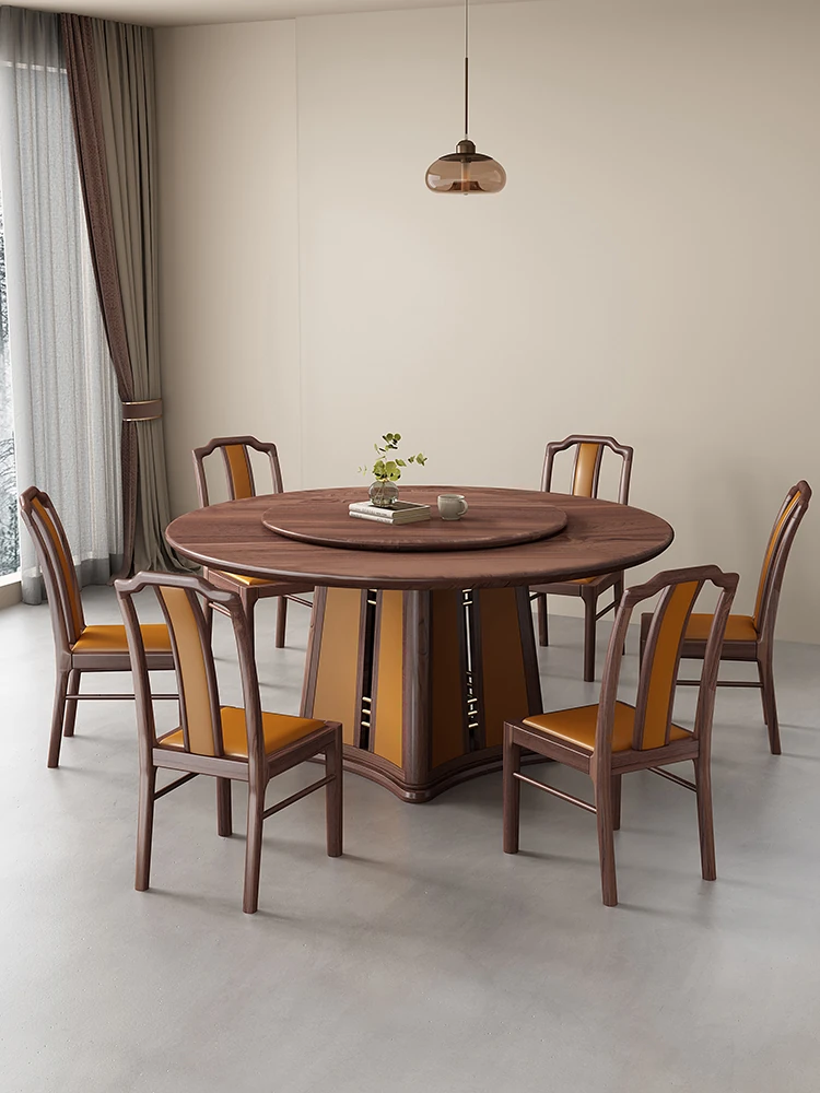 新中式スタイルのブラックウォールナット無垢材ダイニングテーブル&チェアセット - モダンでシンプルなデザイン、広々とした円形テーブルで家族や友人との楽しい食事を演出!リビングにぴったりの一品。