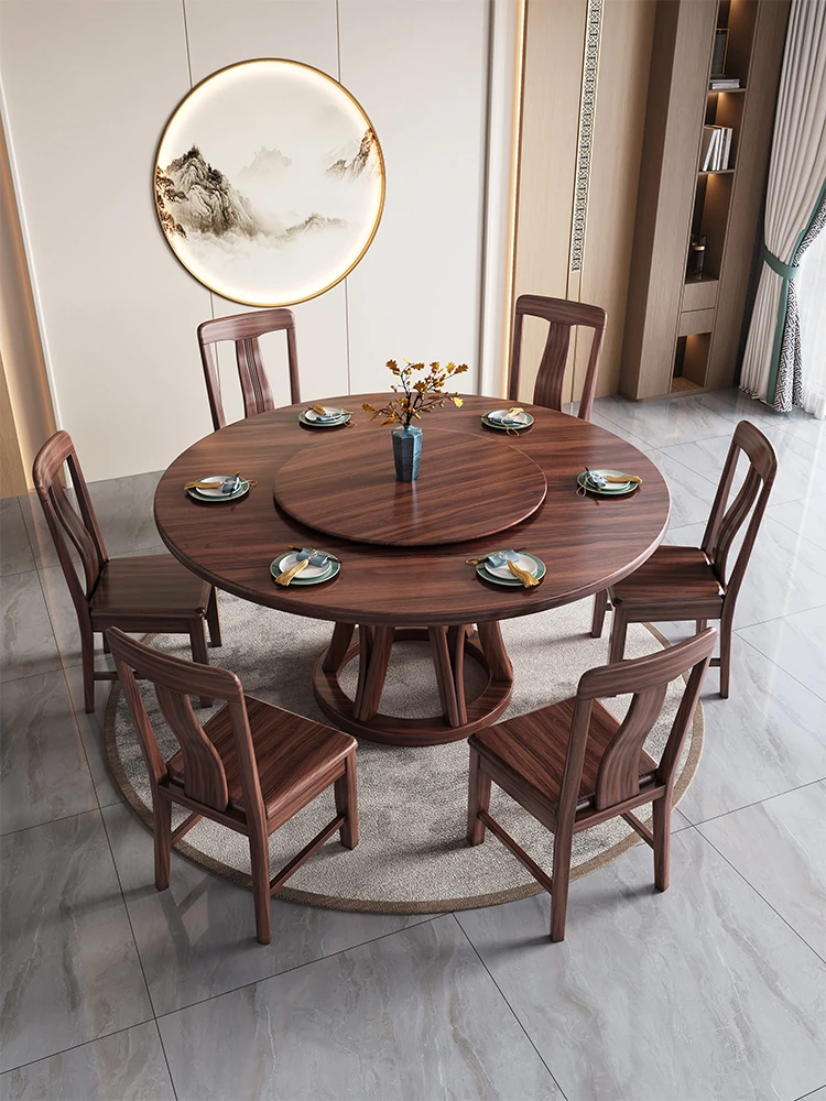 新中式ウッディーウッドの本格的なダイニングテーブル - 回転式の大きな円形テーブル、家族団欒に最適な全木製の食卓!