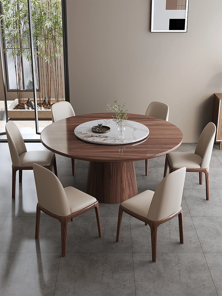 モダンミニマリストのブラックウォールナット無垢材ラウンドダイニングテーブル - 高級感あふれる家庭用、別荘にもぴったりな大きな円形テーブル!