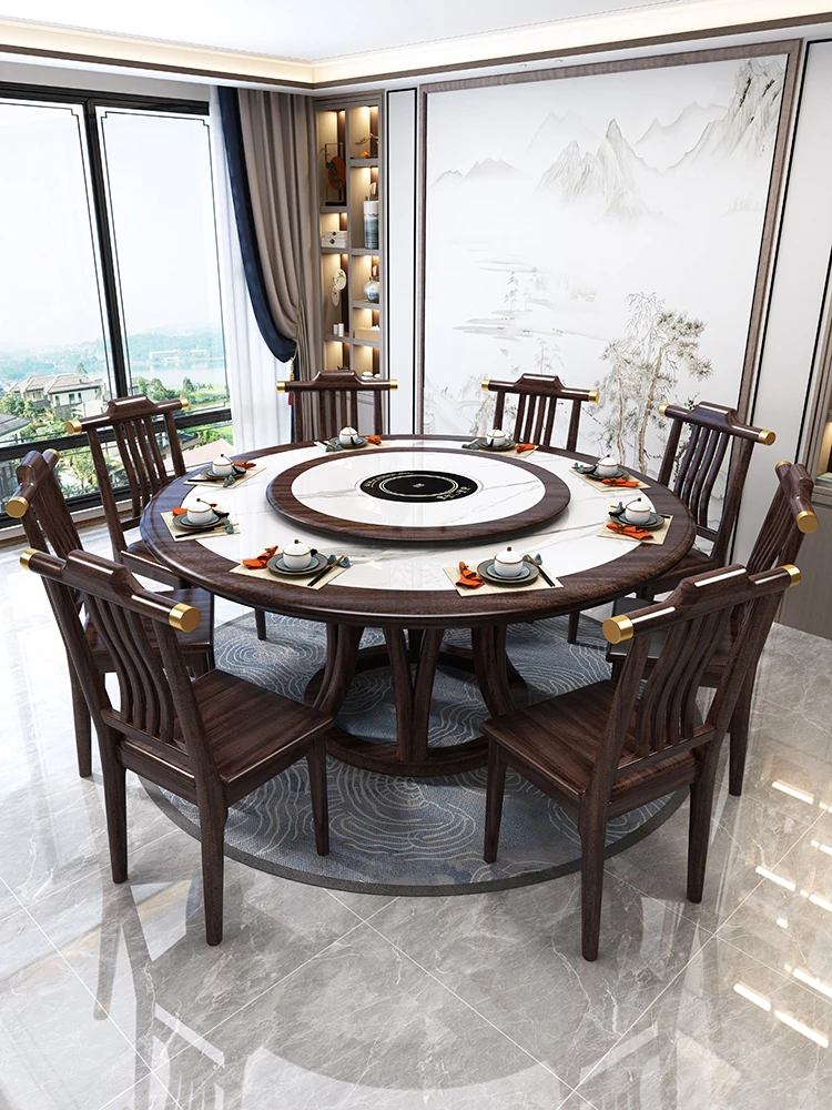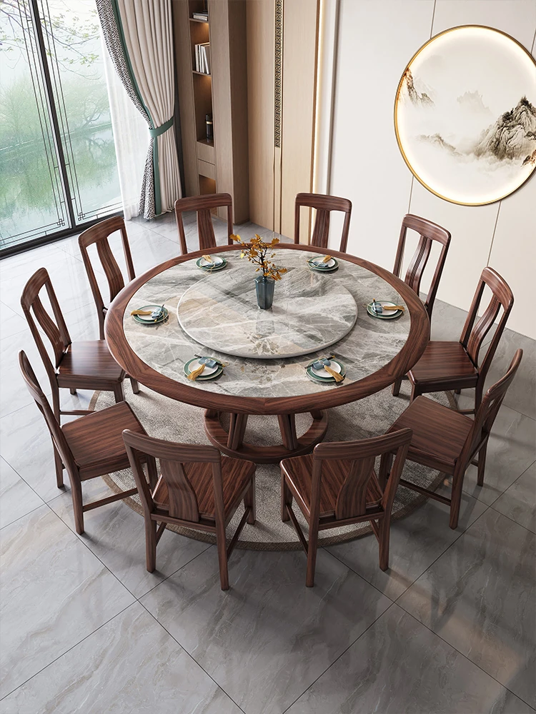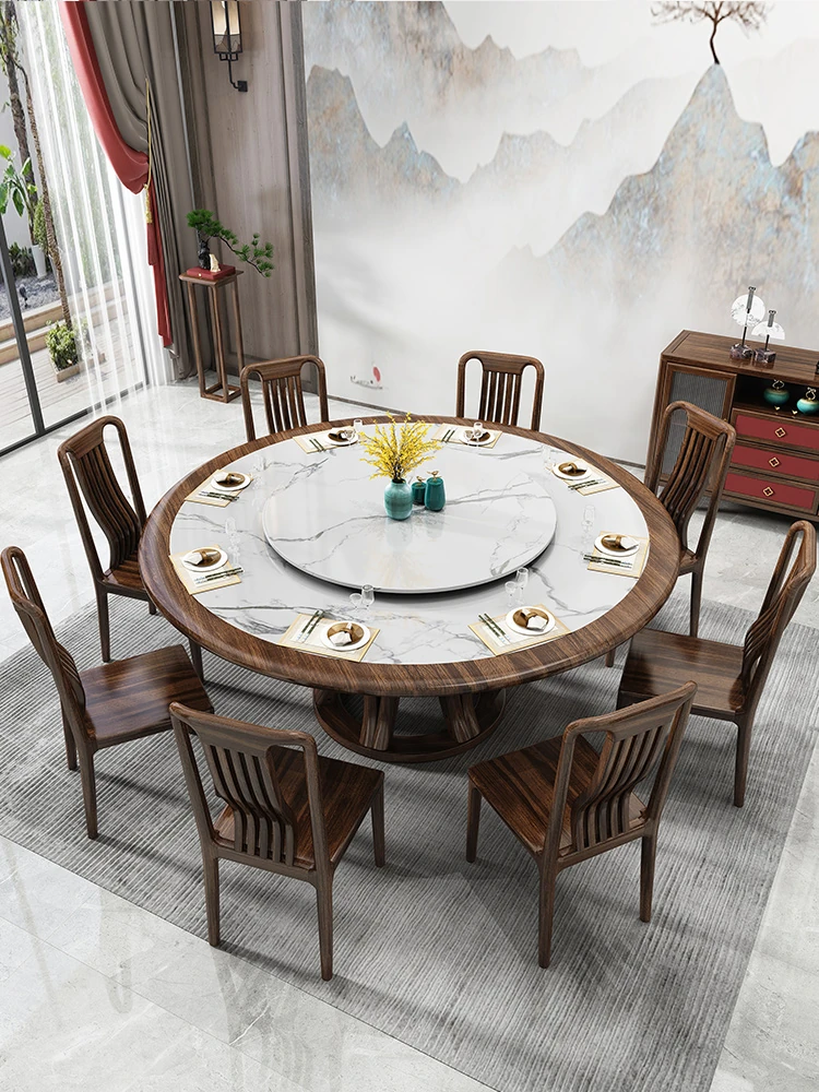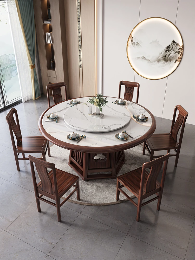 新中式ウッドウッドリアルストーンダイニングテーブル - 家庭用の2メートルラウンドテーブル、回転式プレート付き、ホテルにも最適!エレガントなデザインで、家族や友人との特別なひとときを演出します。