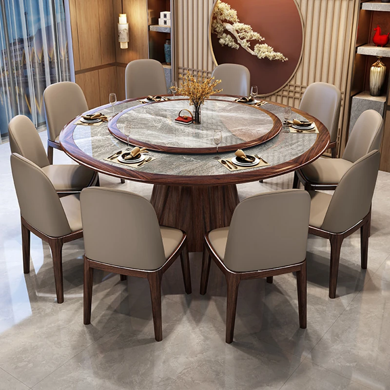 新中式ウッドウィンドウ金属無垢材ロックプレートダイニングテーブル&チェアセット - 回転式で10人まで対応、ホテルや家庭に最適な大きな円形テーブル!