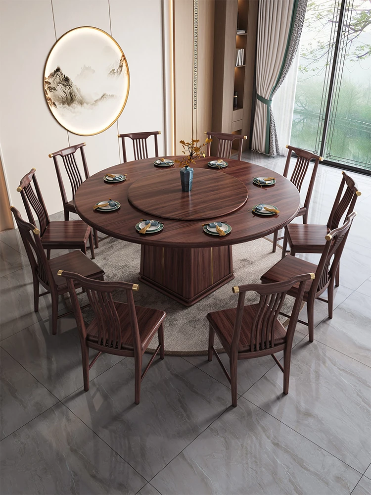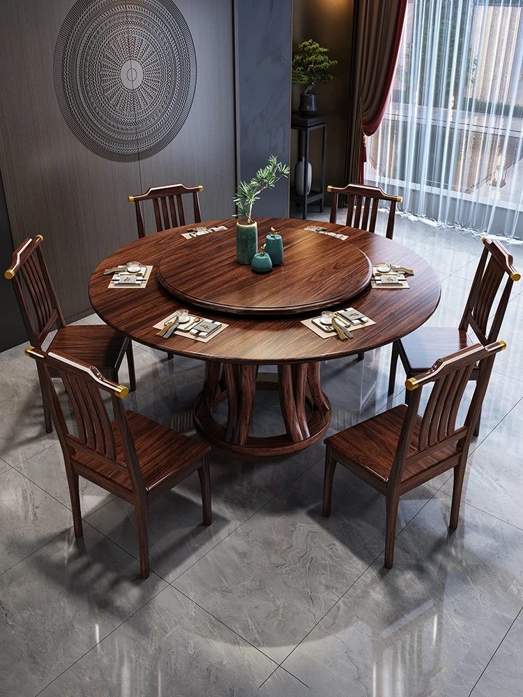 新中式ウッディウッドの実木ダイニングテーブル&チェアセット - 家庭にぴったりのラウンドテーブル、回転式の大きな円卓で、みんなが集まる楽しい食卓を演出します!