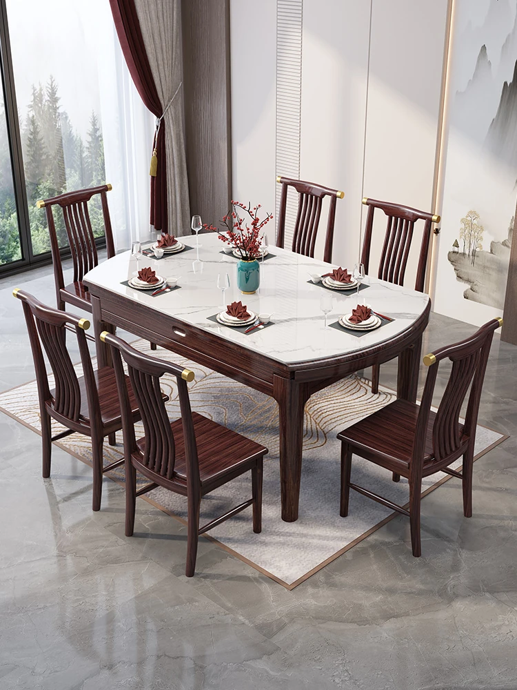 新中式スタイルの岩板ダイニングテーブル|家庭用の実木製、四角から丸へ変形可能!1.5メートルの伸縮デザイン、小型住宅に最適!8人〜10人対応、家族団らんのひとときを演出します。