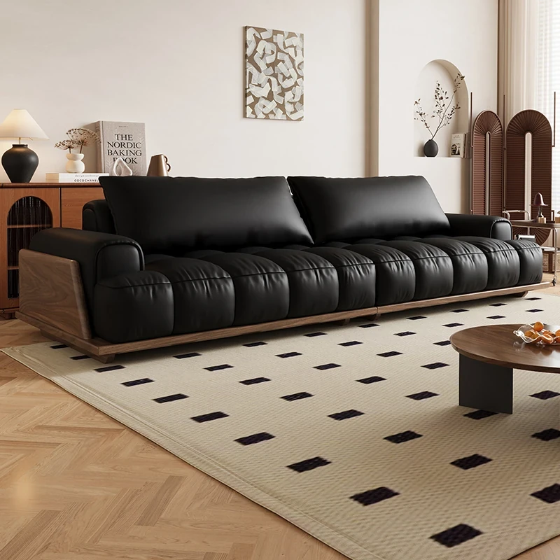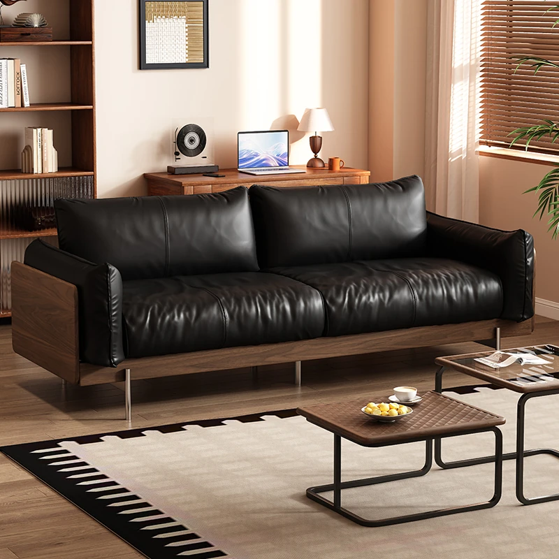 Modern Minimalist Black Walnut Solid Wood Leather Sofa for Small Living Rooms - 3-Seater 2024 Design