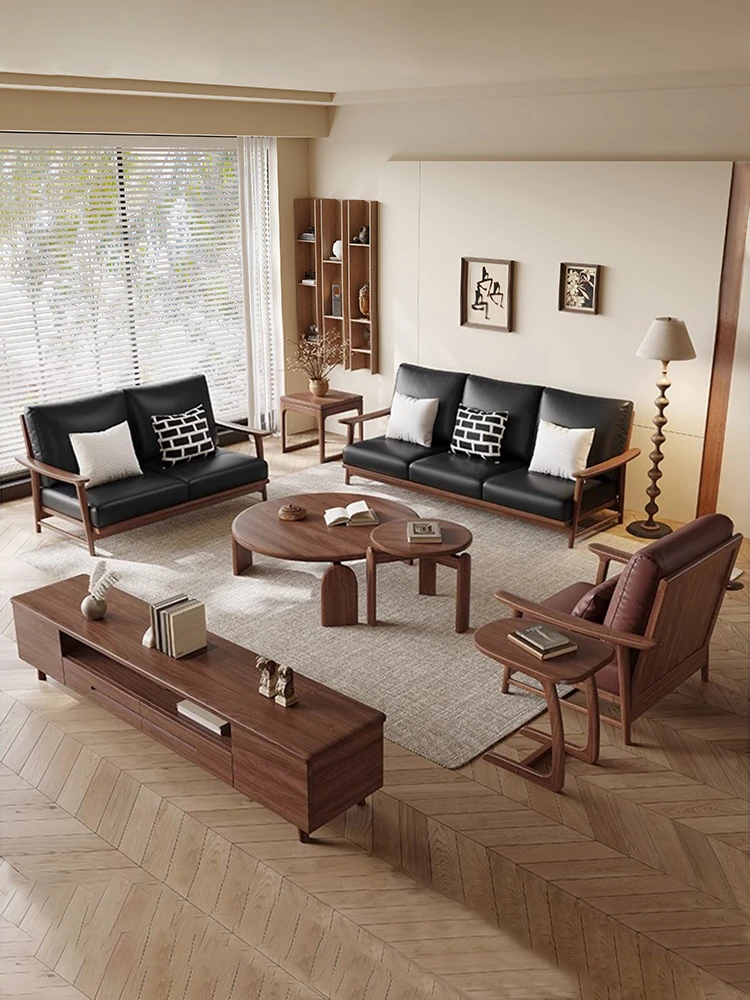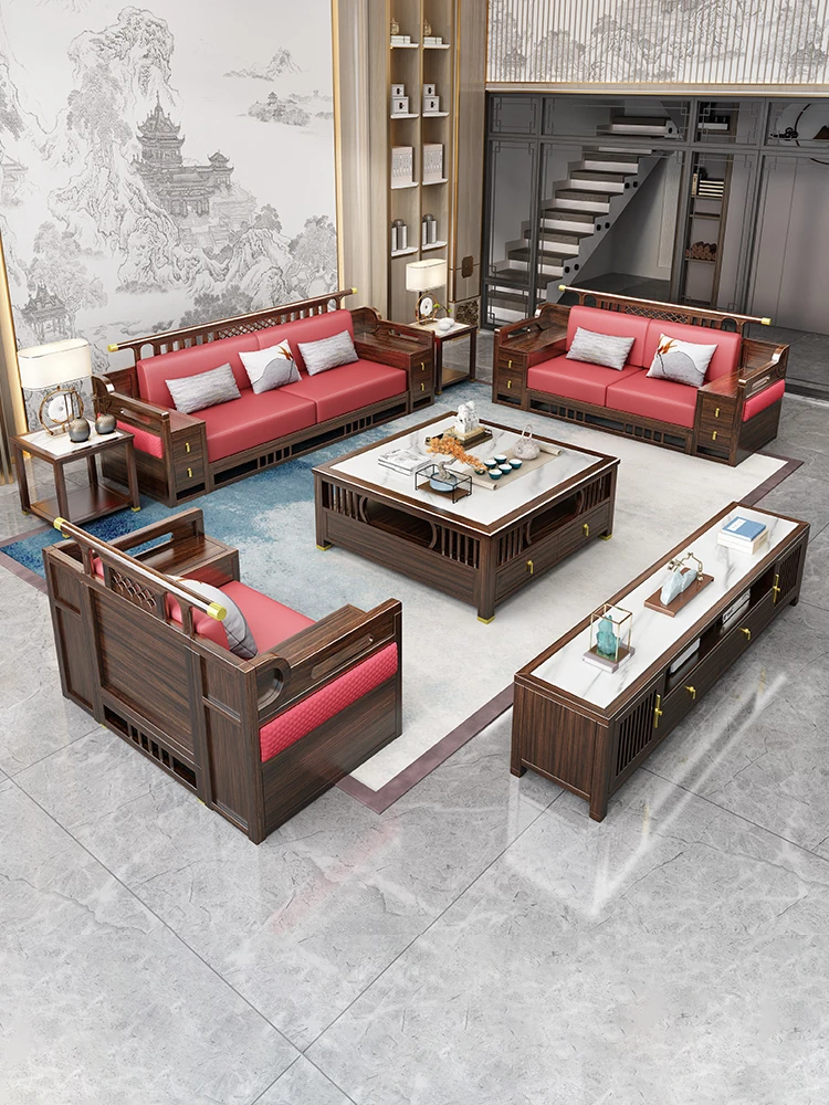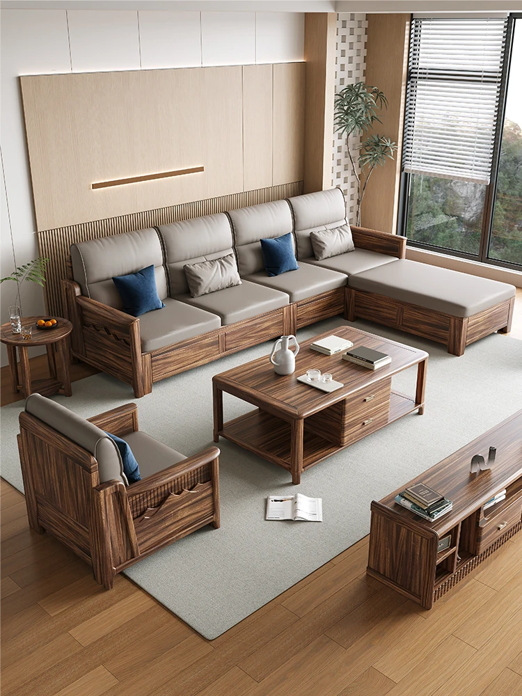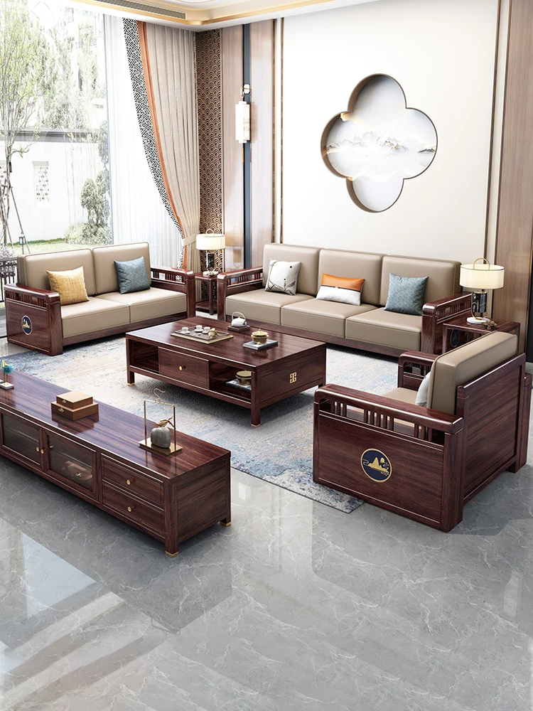 Modern Minimalist New Chinese Black Walnut Solid Wood Sofa Set - Genuine Leather and Fabric Living Room Sofa for Home Use