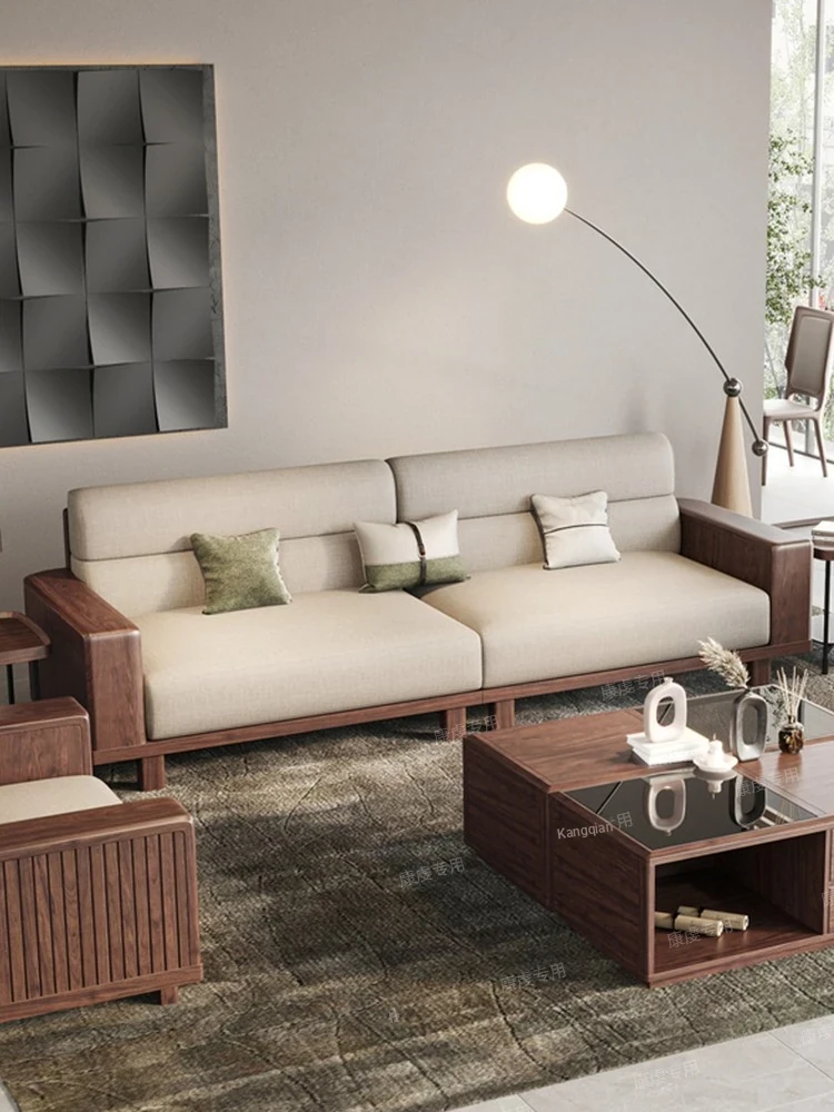 Modern Minimalist Solid Wood Sofa Set in Black Walnut - Stylish Cotton and Linen Upholstery for Chinese Living Room, Perfect for Home Décor