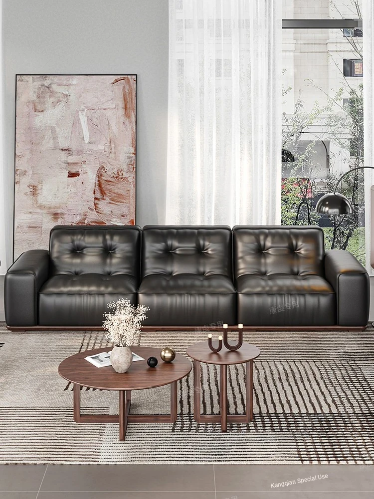 French Vintage Solid Wood Leather Sofa in Black Walnut - Premium Cowhide Upholstery, 2025 New Arrival, Elegant Straight-Line Design for Your Living Room