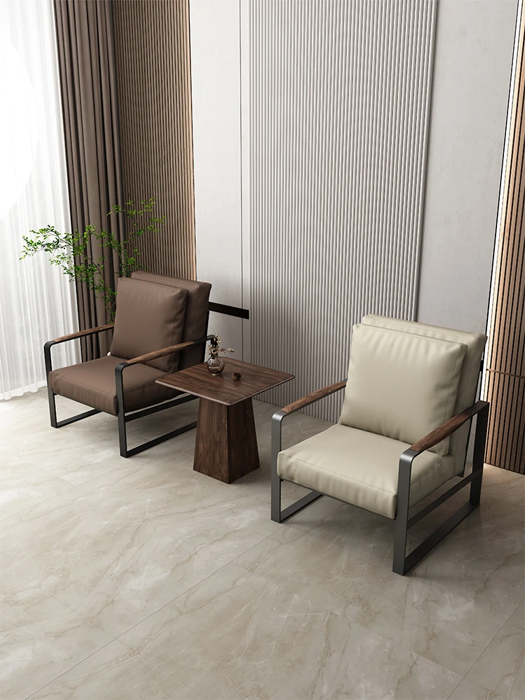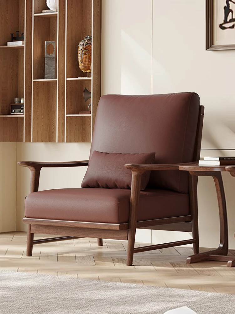 Modern Minimalist Black Walnut Wood Lounge Chair - Solid Wood Sofa Chair with Genuine Leather for Living Room - Scandinavian Style Single Seat