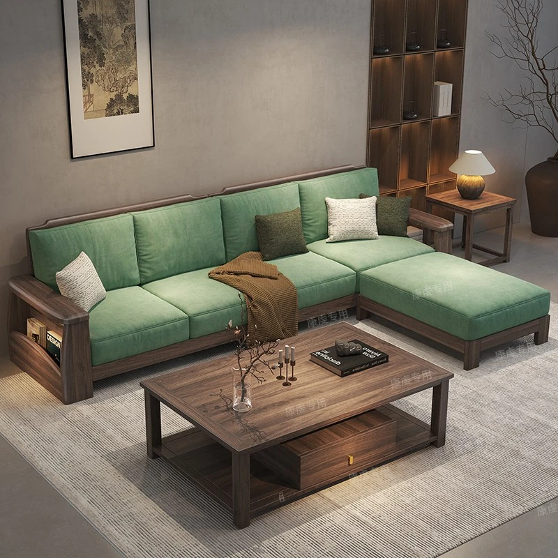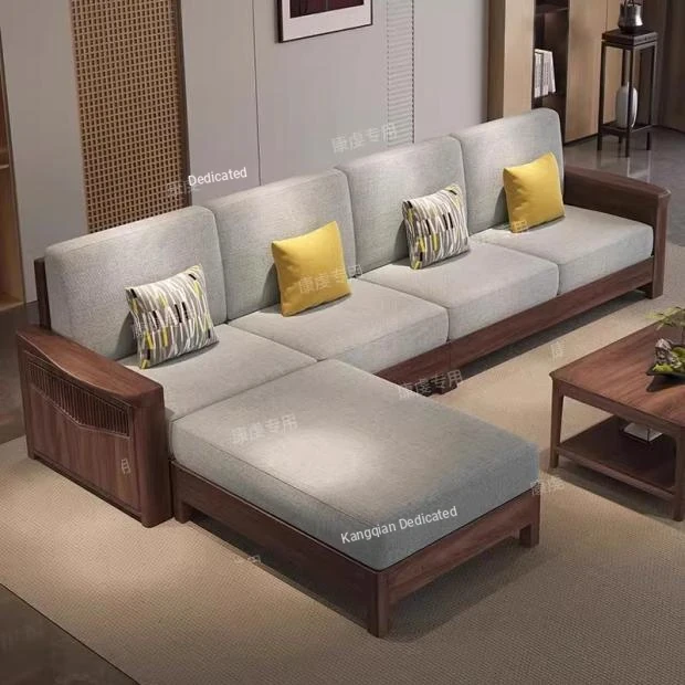 Elegant New Chinese Style Solid Walnut Sofa Chaise Lounge Set - L-Shaped, Winter & Summer Versatile Furniture for Cozy Small Living Rooms