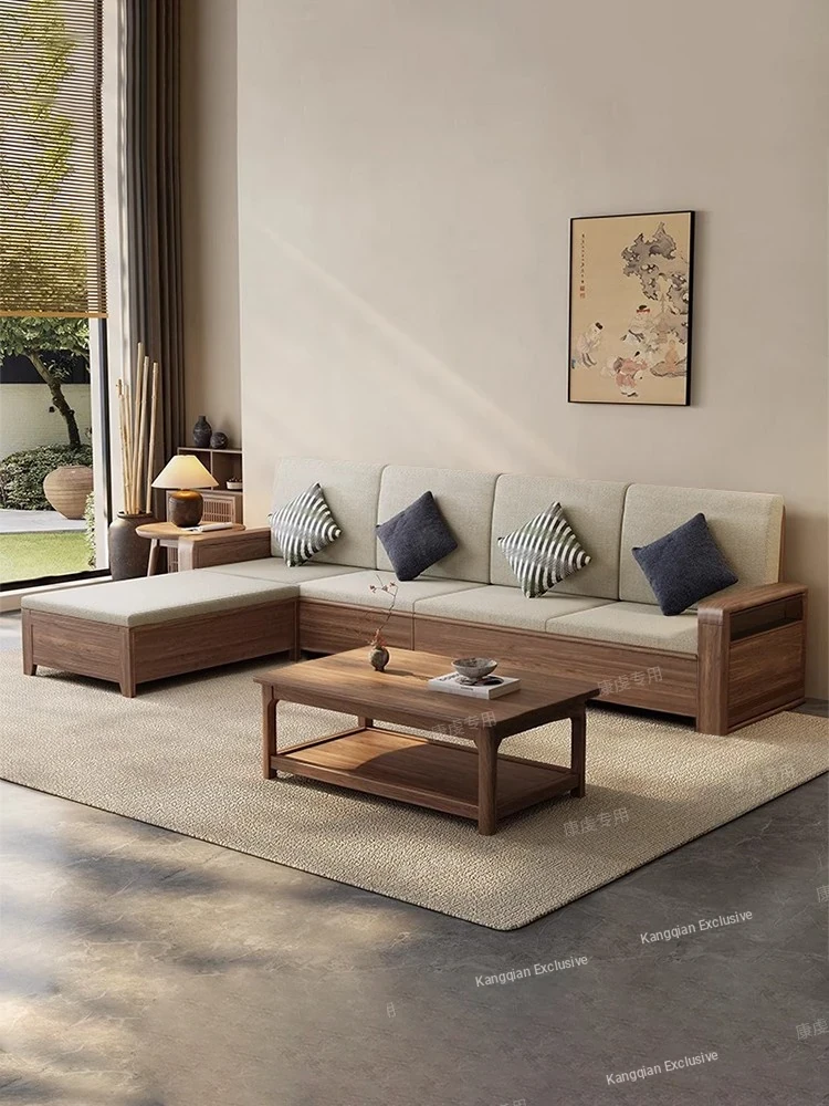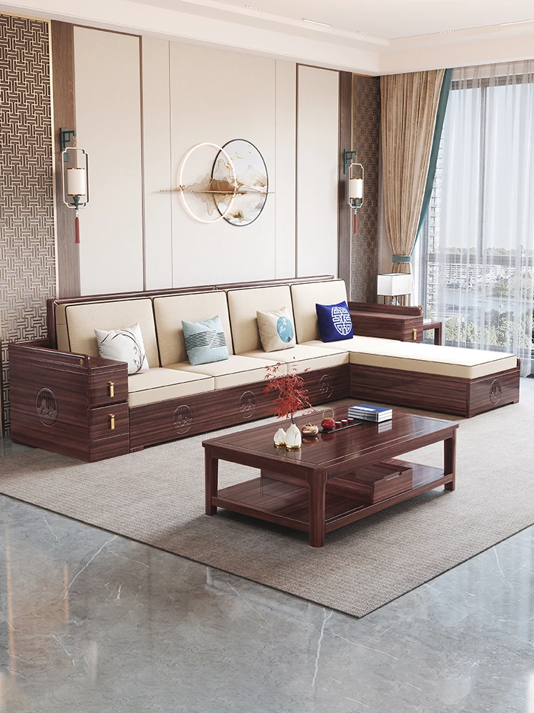 New Chinese Style Solid Wood Sofa Set with Black Walnut Finish - Corner Chaise Lounge, Dual-Season Design, Minimalist Storage Furniture for Modern Living Spaces