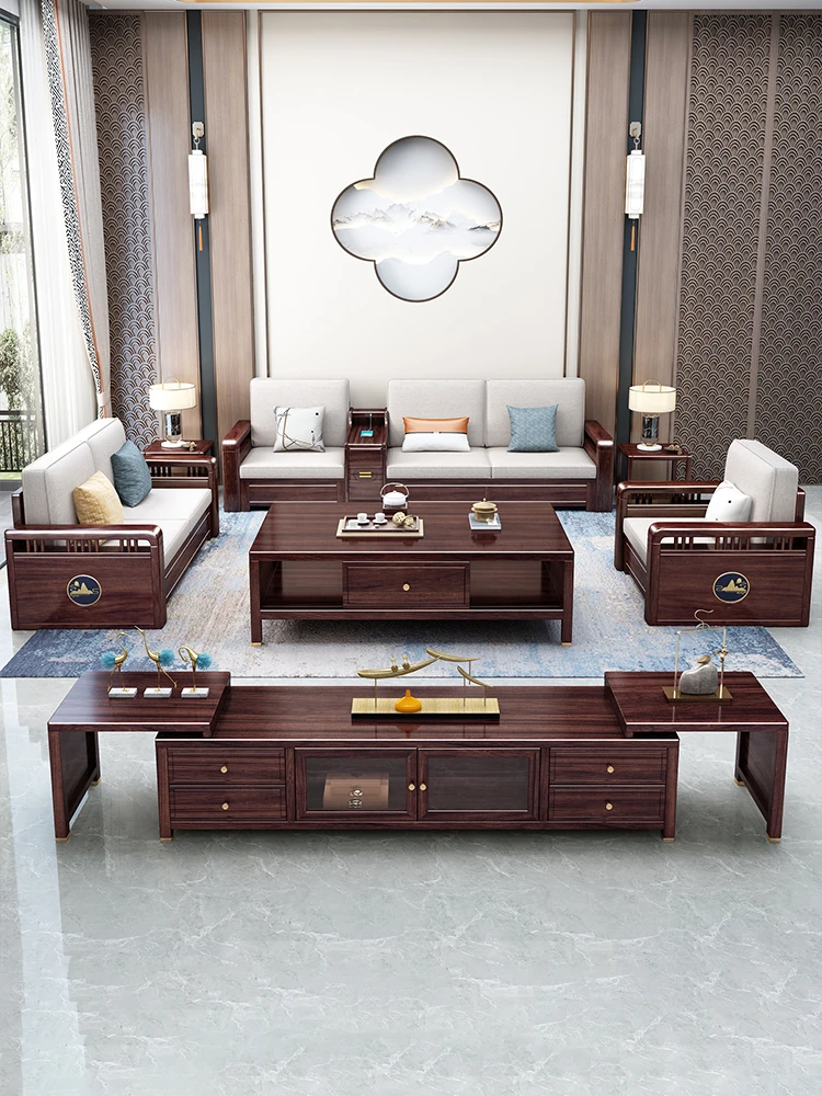 Modern Minimalist New Chinese Solid Wood Sofa Set - Zen-Inspired Fabric Living Room Furniture in Black Walnut Finish for Home Use