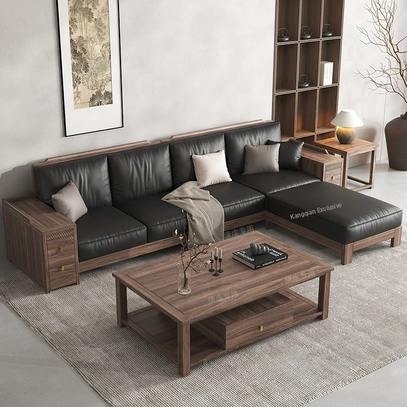Black Walnut New Chinese Style Solid Wood Sofa - Versatile Corner Chaise Lounge for All Seasons, Perfect Storage Solution for Small and Large Living Rooms, Ideal for Home Furniture