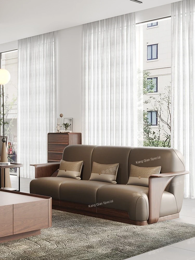 High-End Modern Minimalist Nordic Solid Wood Black Walnut Sofa Set with Genuine Leather, Elegant Italian Style Living Room Furniture