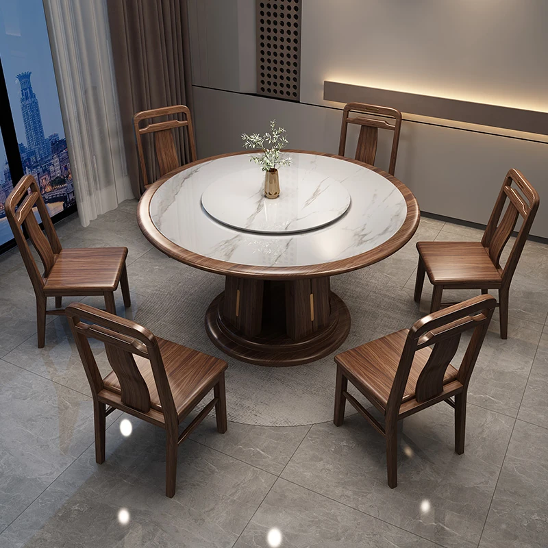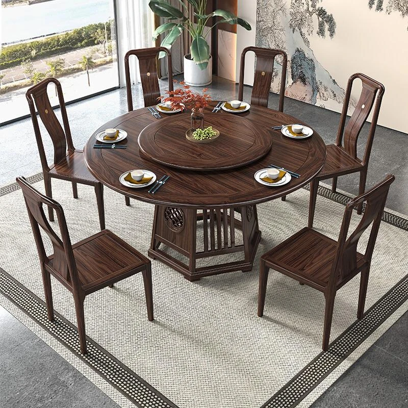 Solid Black Walnut Round Dining Table with Rotating Tray - 2m Large Table for Home and Restaurant Use, Perfect for Hotels and Gatherings
