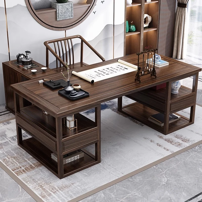 Premium Black Gold Wood Solid Wood Desk and Chair Set - Elegant New Chinese Style Office Furniture for Executives, Perfect for Calligraphy and Tea Ceremonies.