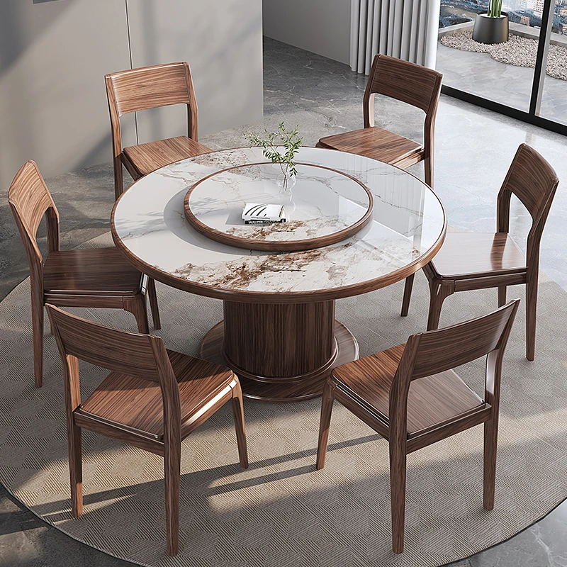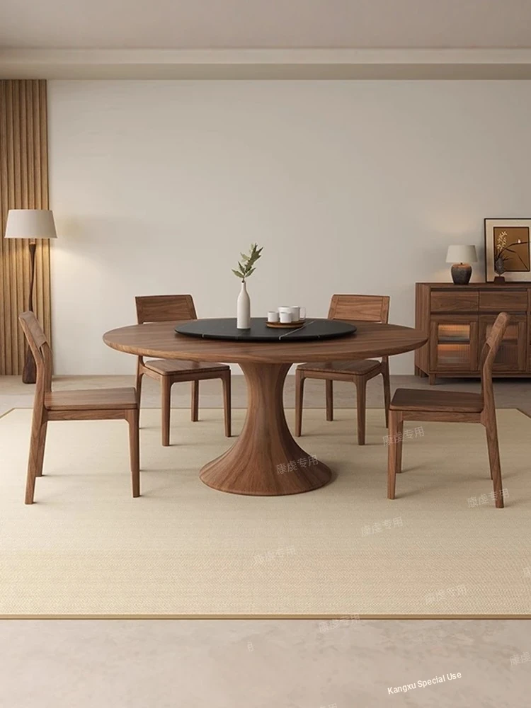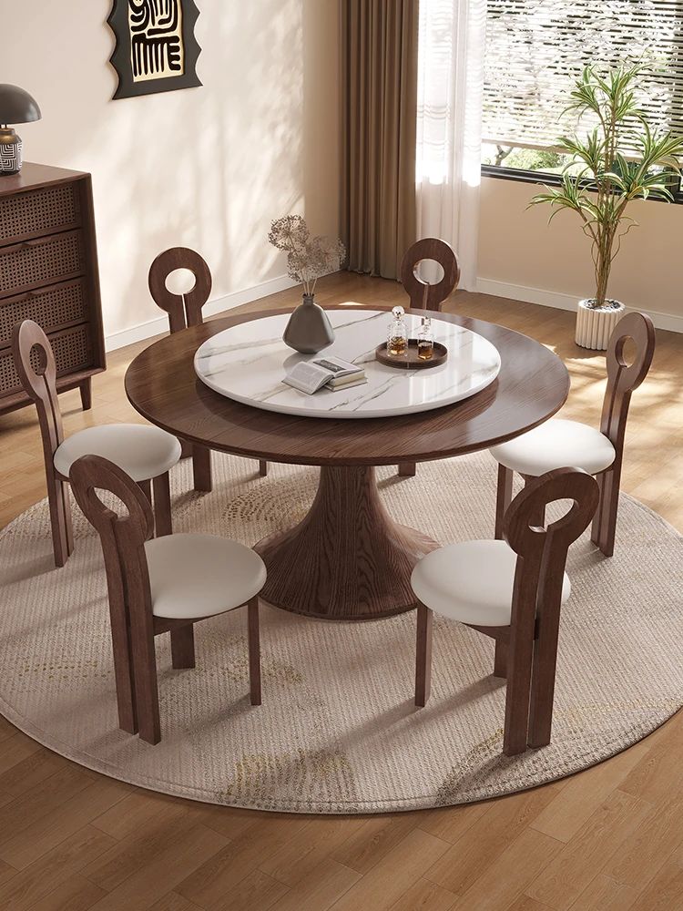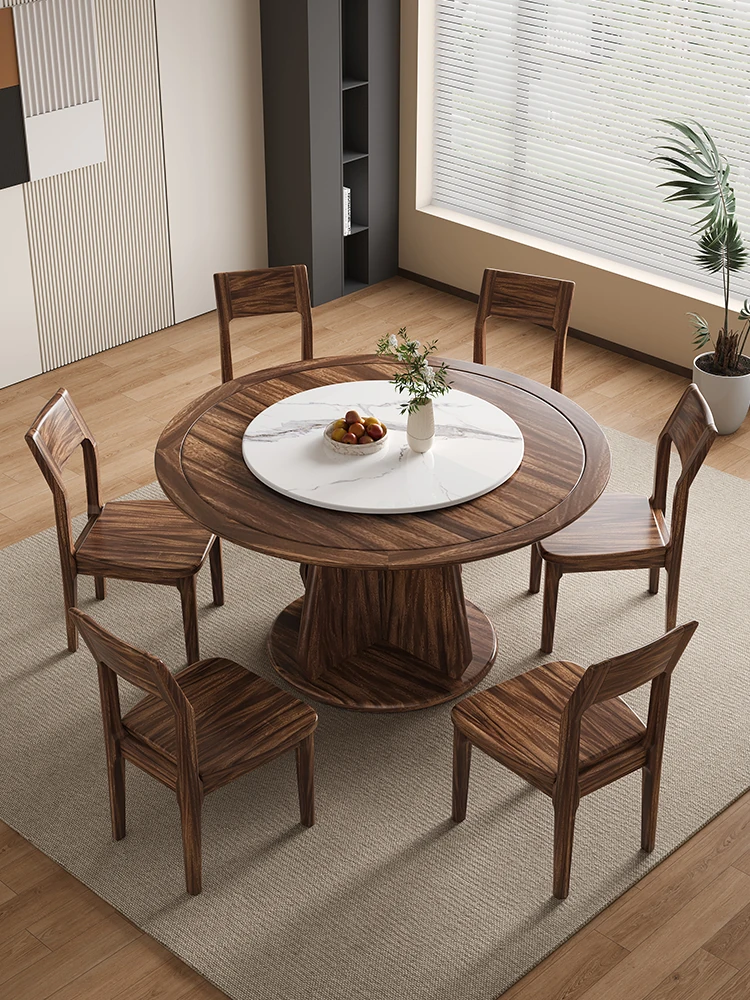 Solid Wood Dining Table and Chair Set - Round Dining Table with Rotating Tray, Elegant Black Walnut Finish, Perfect for Family Meals and Gatherings.