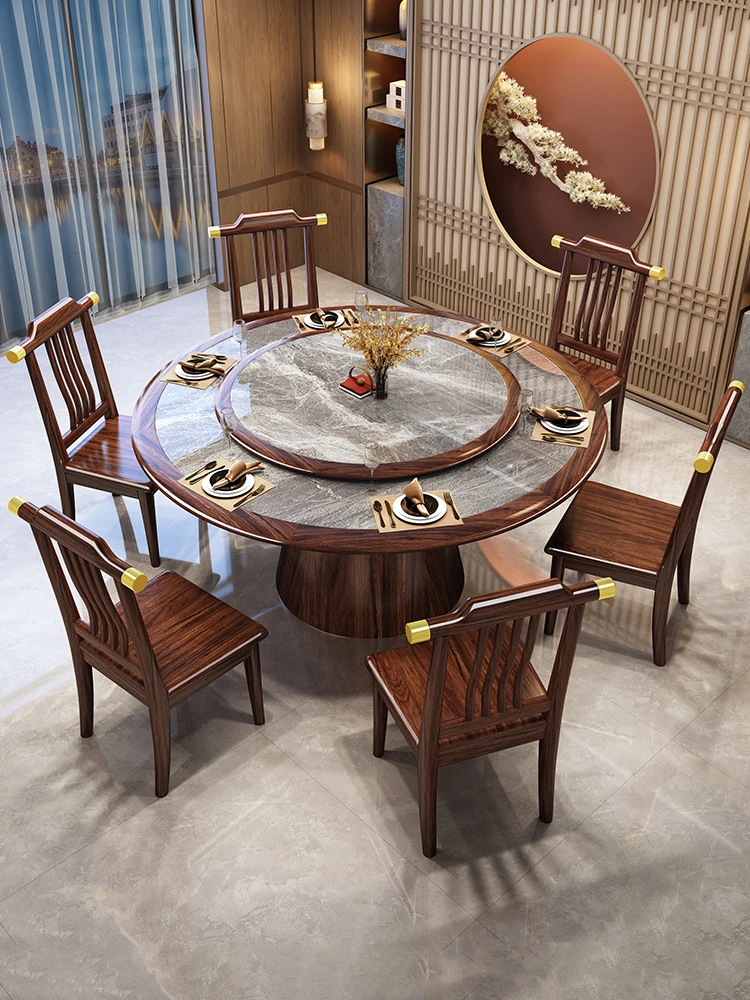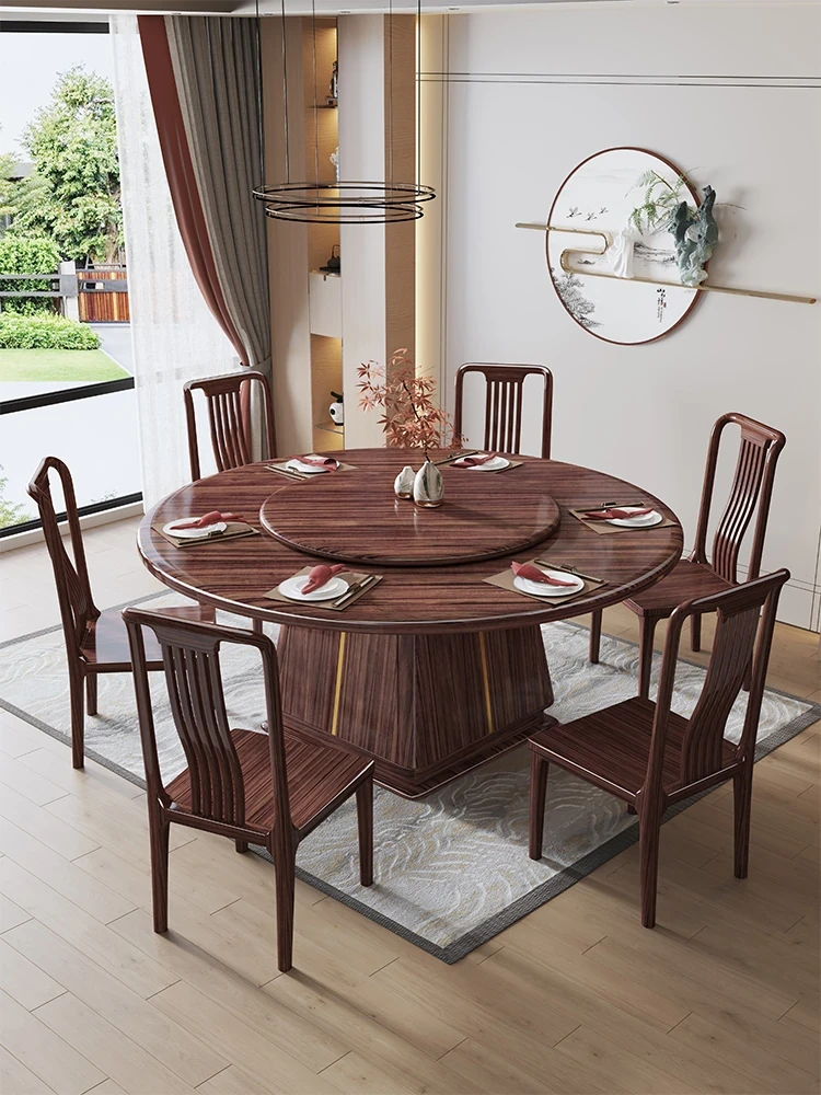 New Chinese Style Solid Wood Dining Table - 2m Round Black Walnut Table for Home and Restaurant, Seats 12 with Rotating Tray