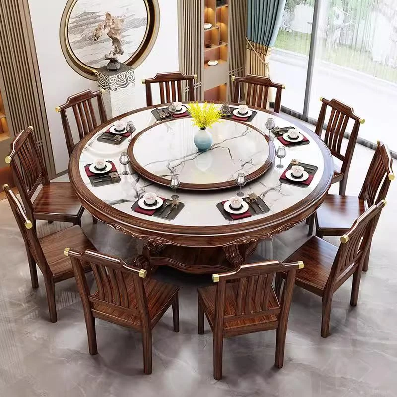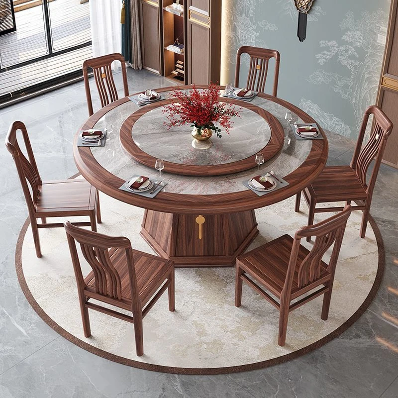 Solid Wood Round Dining Table with Lazy Susan - Elegant Blackwood Design for Home and Hotel Use, Perfect for Family Gatherings and Entertaining Guests.