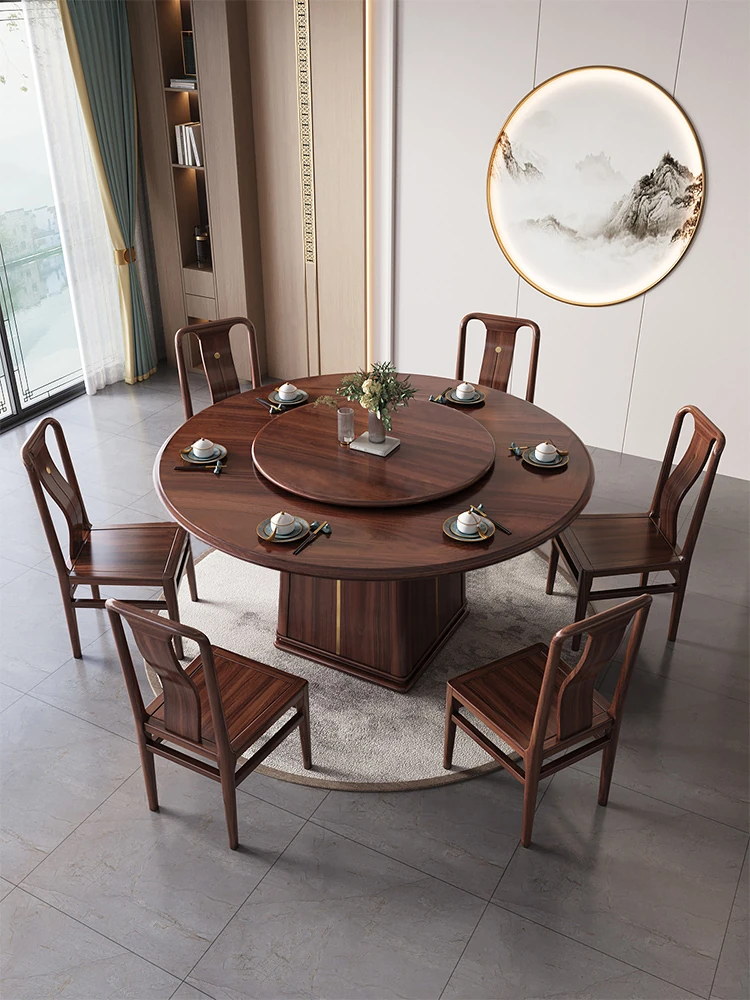 Elegant Black Walnut Solid Wood Dining Table and Chair Set - New Chinese Style Round Dining Table for Small Spaces, Seats Up to 12 People - Perfect for Homes and Hotels