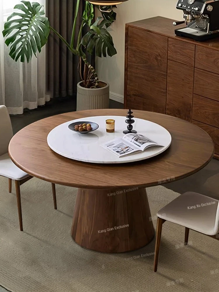 Stylish Walnut Wood Dining Table Set with Inlaid Design and Rotating Turntable - Modern Minimalist Round Table for Home Use