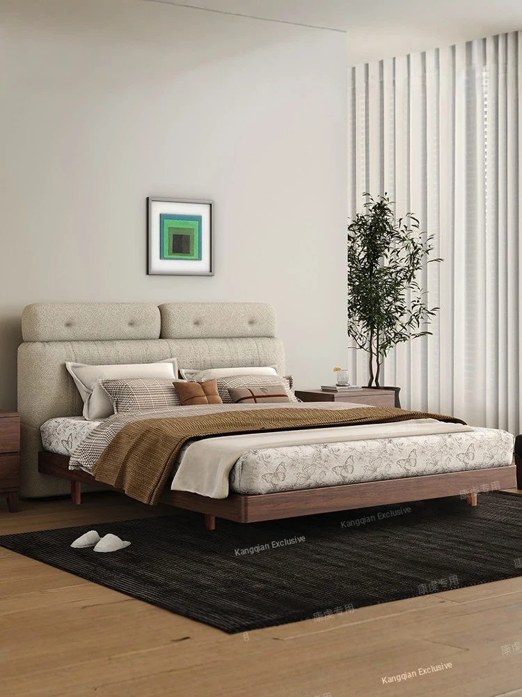 Nordic Style Solid Black Walnut Wood 1.8m Double Bed - Modern Floating Bed for Master Bedroom, Ideal for Small Spaces, with Soft Upholstered Design for Couples