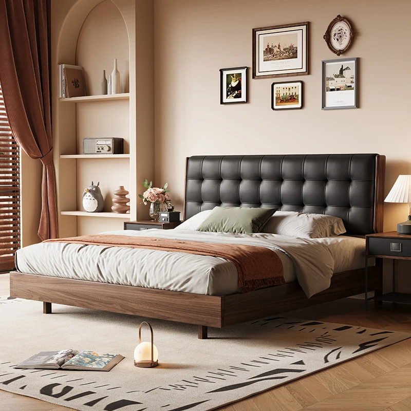 French Vintage Solid Wood Leather Bed - Double Soft Backrest Bed in Black Walnut, 1.8m - New 2025 Model for Master Bedroom & Couples' Retreat