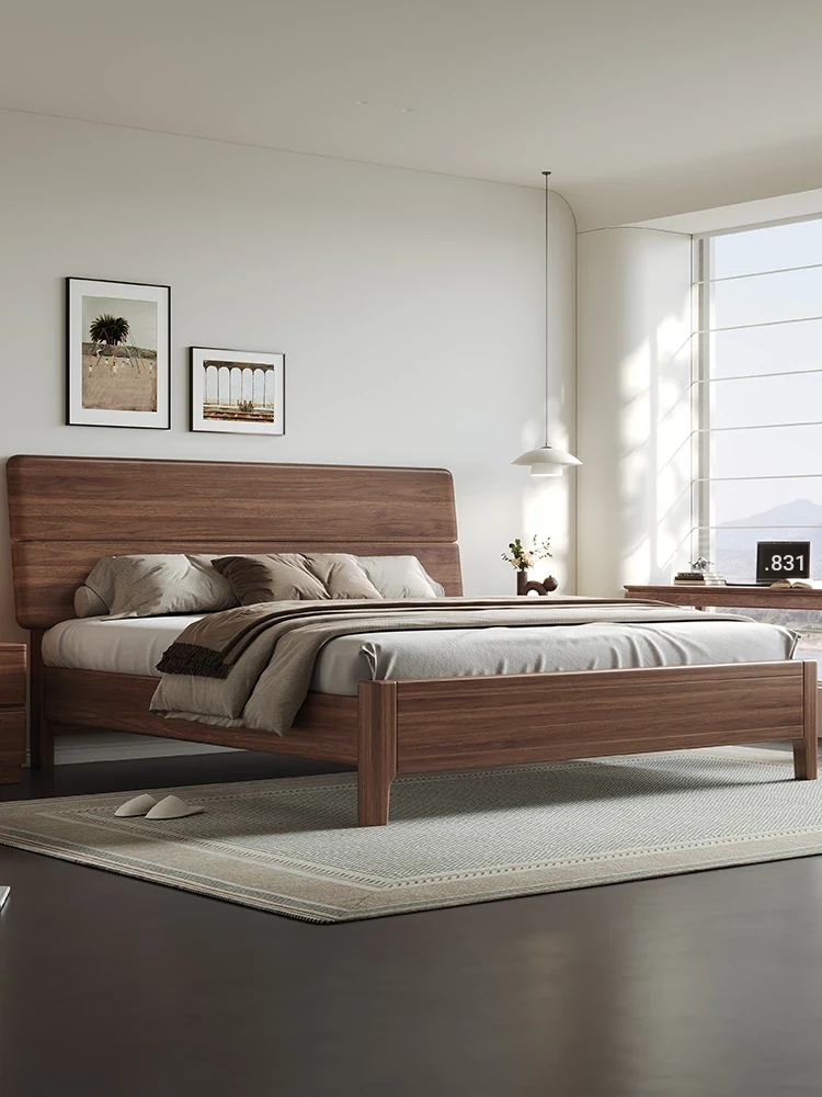 Modern Minimalist Solid Black Walnut Wood Bed - Stylish 1.5m Storage Double Bed for Master Bedroom, Perfect for a Natural Wood Aesthetic