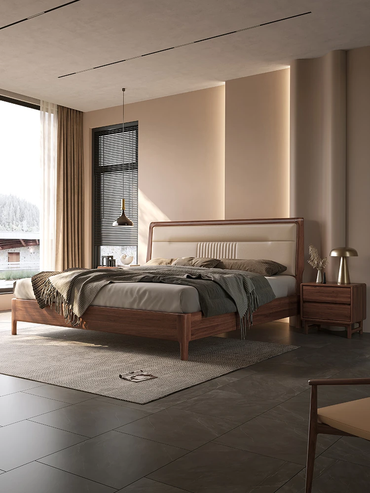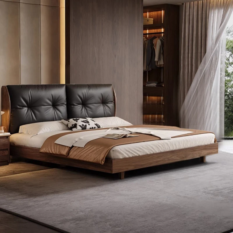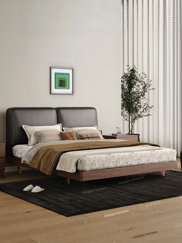 Black Walnut Solid Wood Bed with Genuine Leather Soft Package - Minimalist Design 2.0m Large Bed for Master Bedroom, 1.8m Double Bed for Home, Perfect Wedding Bed