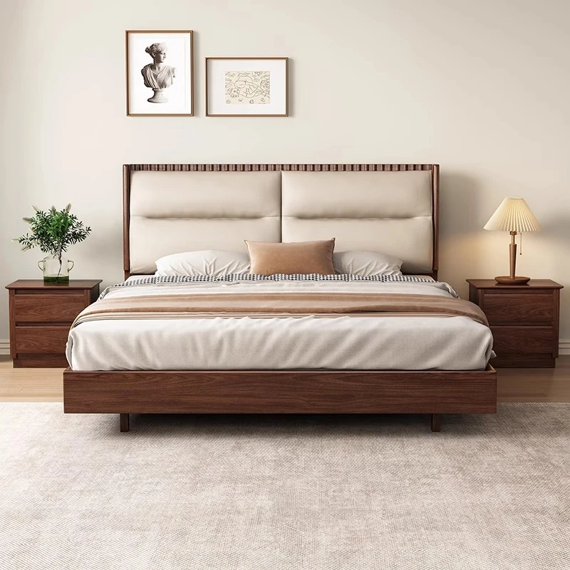 Solid Black Walnut Wood King Size Bed with Soft Headboard - 1.8m Double Bed for Small Bedrooms, Stylish High-Storage Wedding Bed