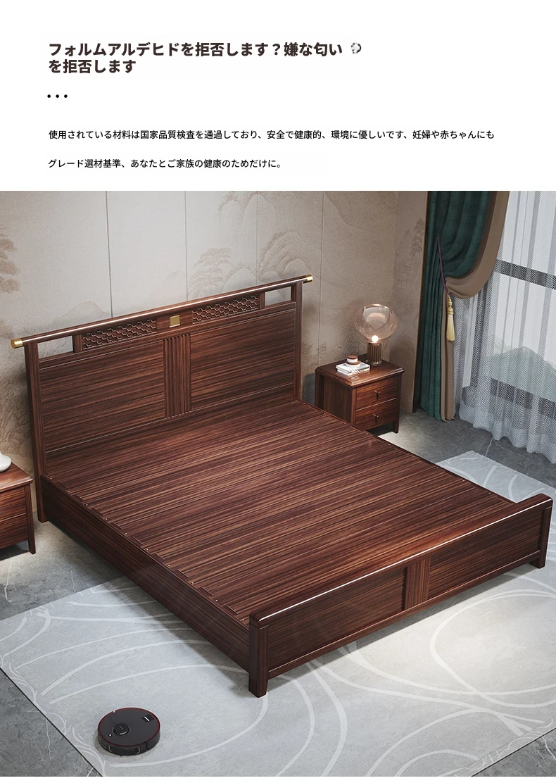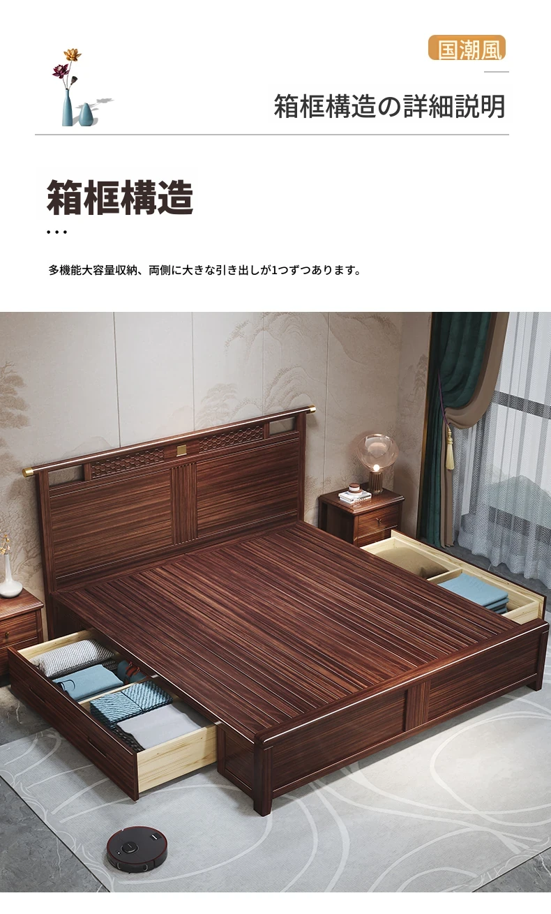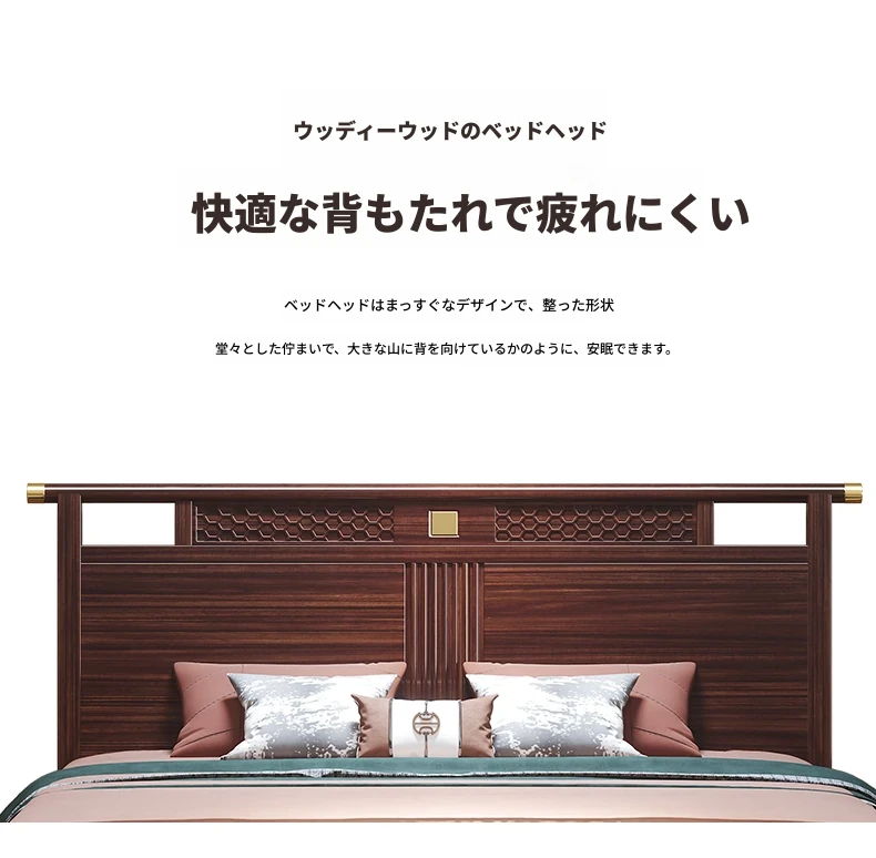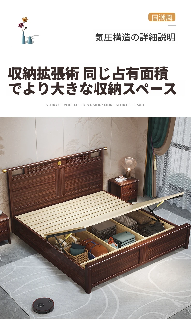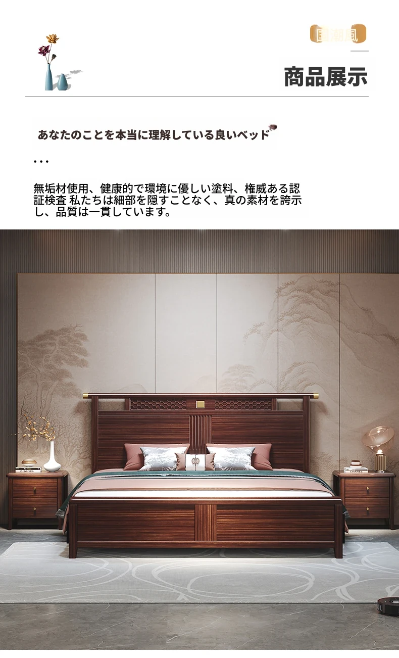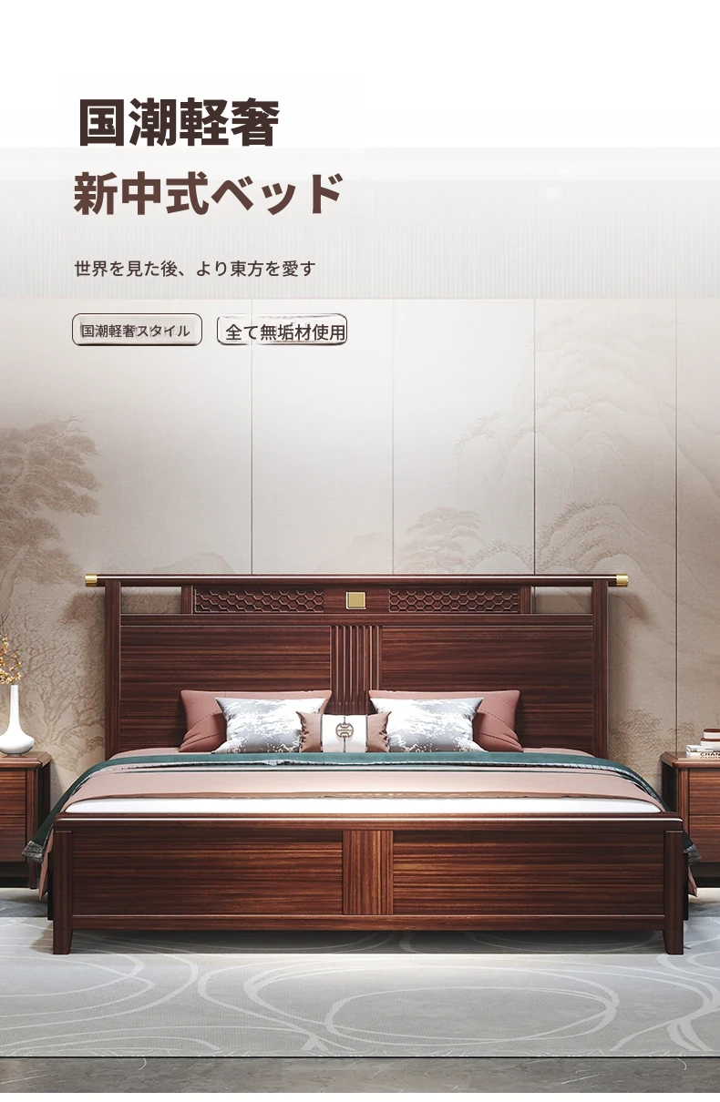 新中式ウッド調ウジン木製ベッド 1.8m ダブルベッド 主寝室用 官帽デザイン 大型ベッド 1.5m 現代的シンプル収納 婚礼用ベッドで、心地よい睡眠をお届けします。