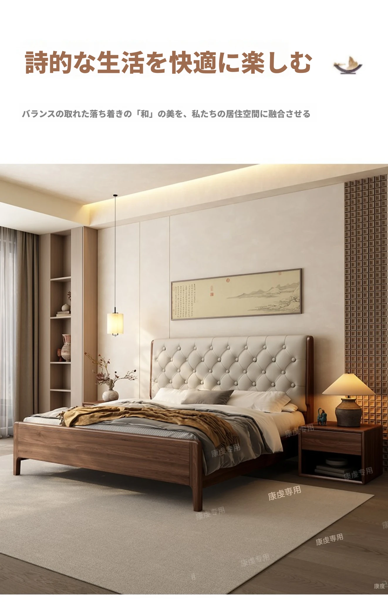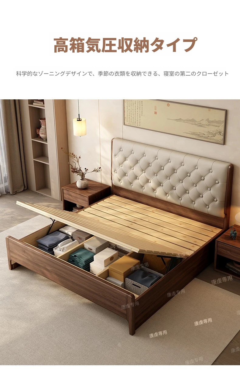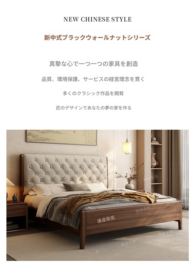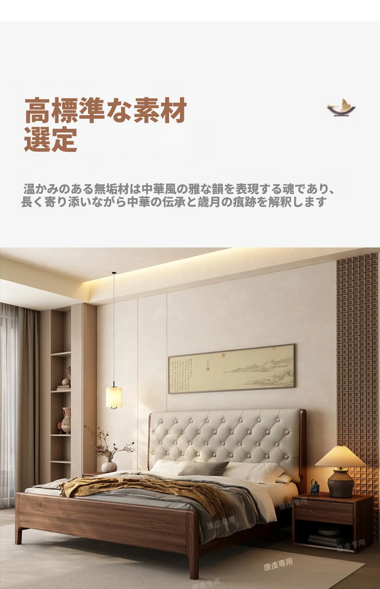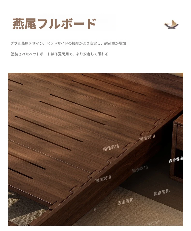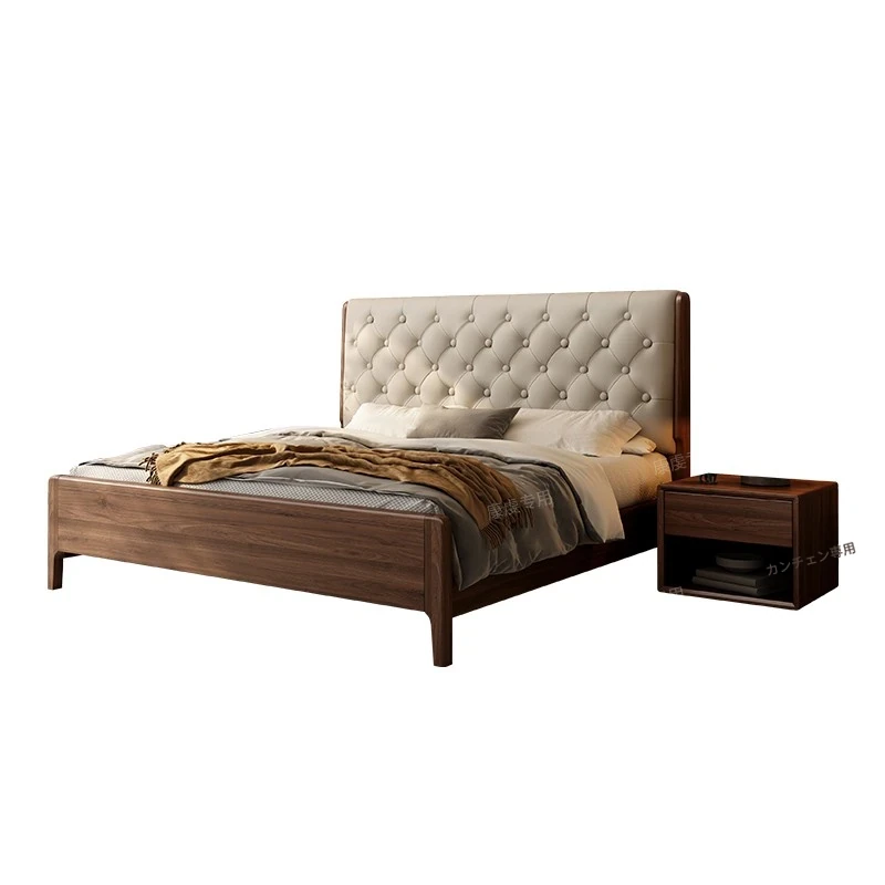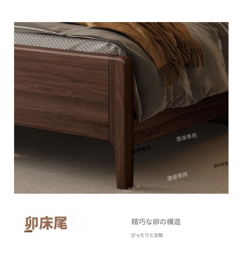 ブラックウォルナット無垢材の新中式ダブルベッド - モダンでシンプルなデザイン、小型住宅に最適な収納機能付き、結婚生活を華やかに彩る主寝室用ベッド。