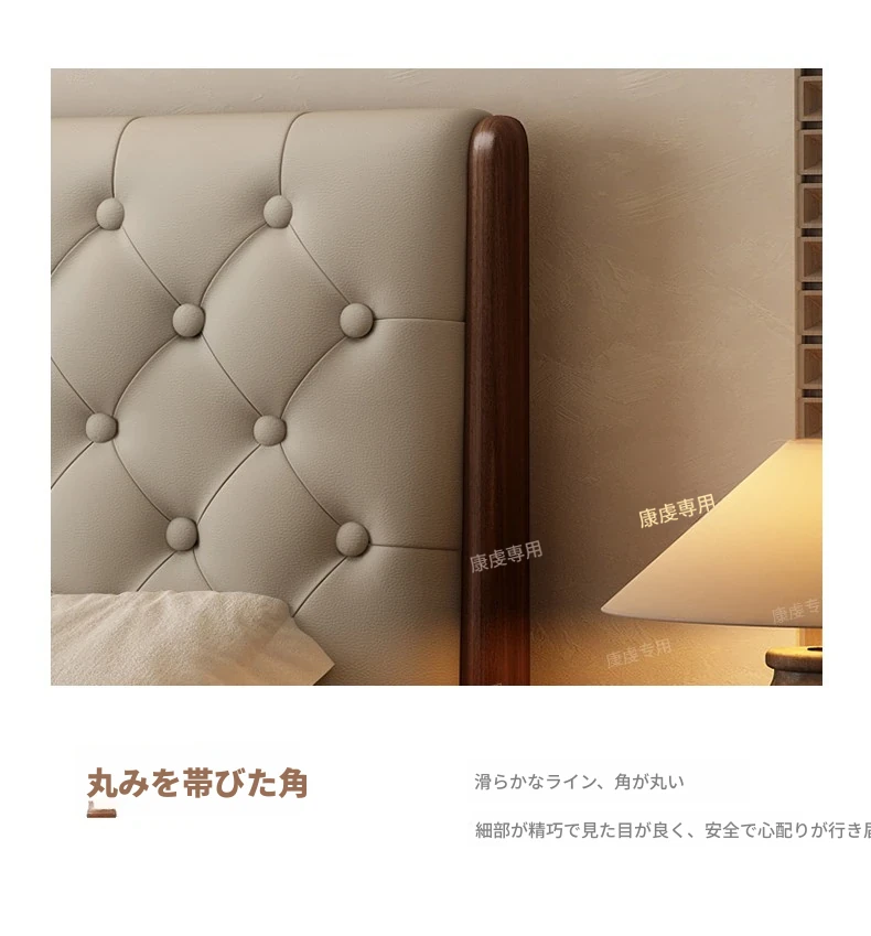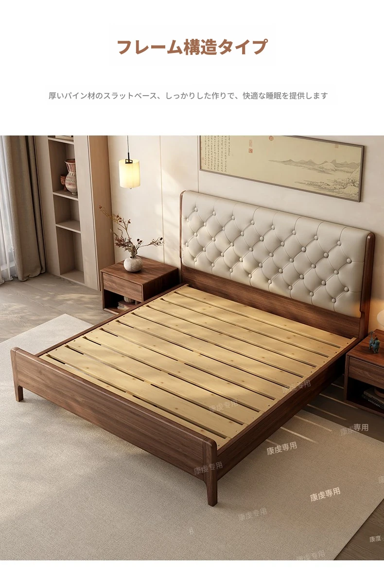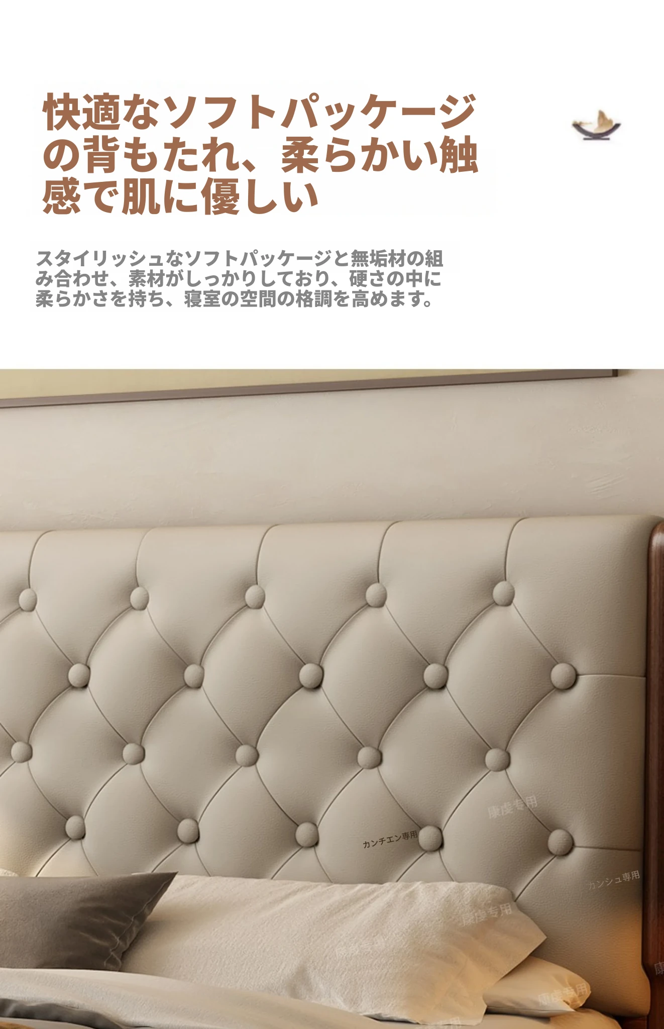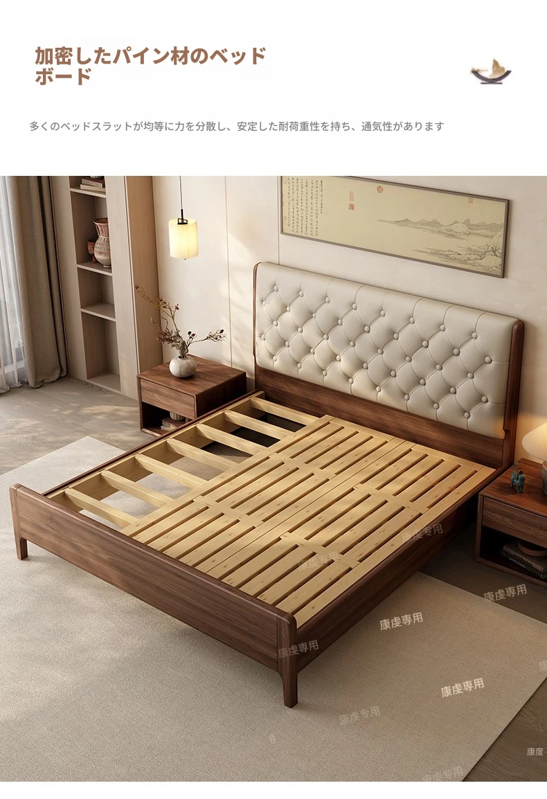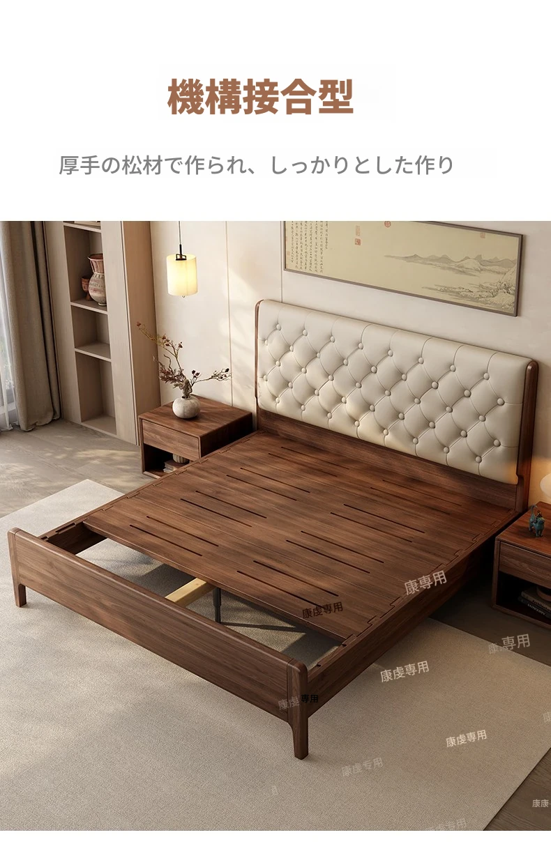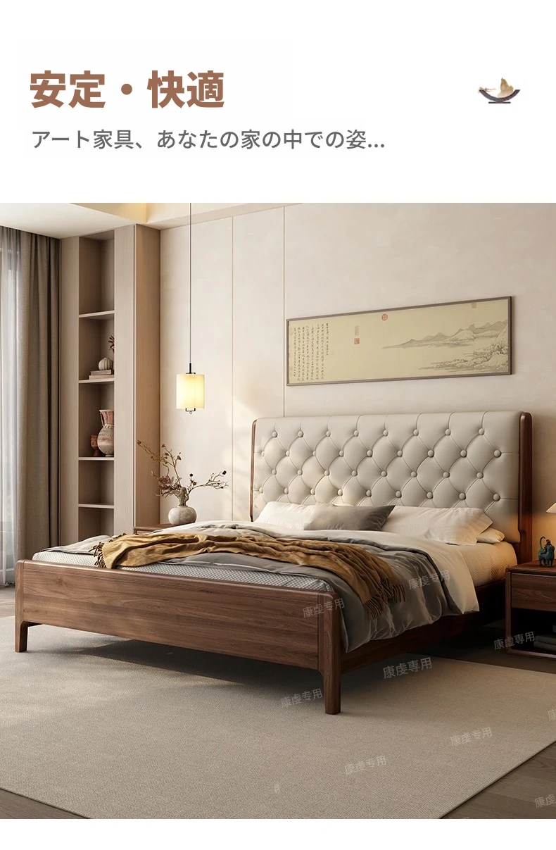 ブラックウォルナット無垢材の新中式ダブルベッド - モダンでシンプルなデザイン、小型住宅に最適な収納機能付き、結婚生活を華やかに彩る主寝室用ベッド。